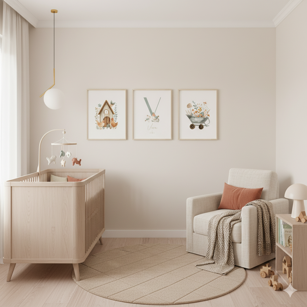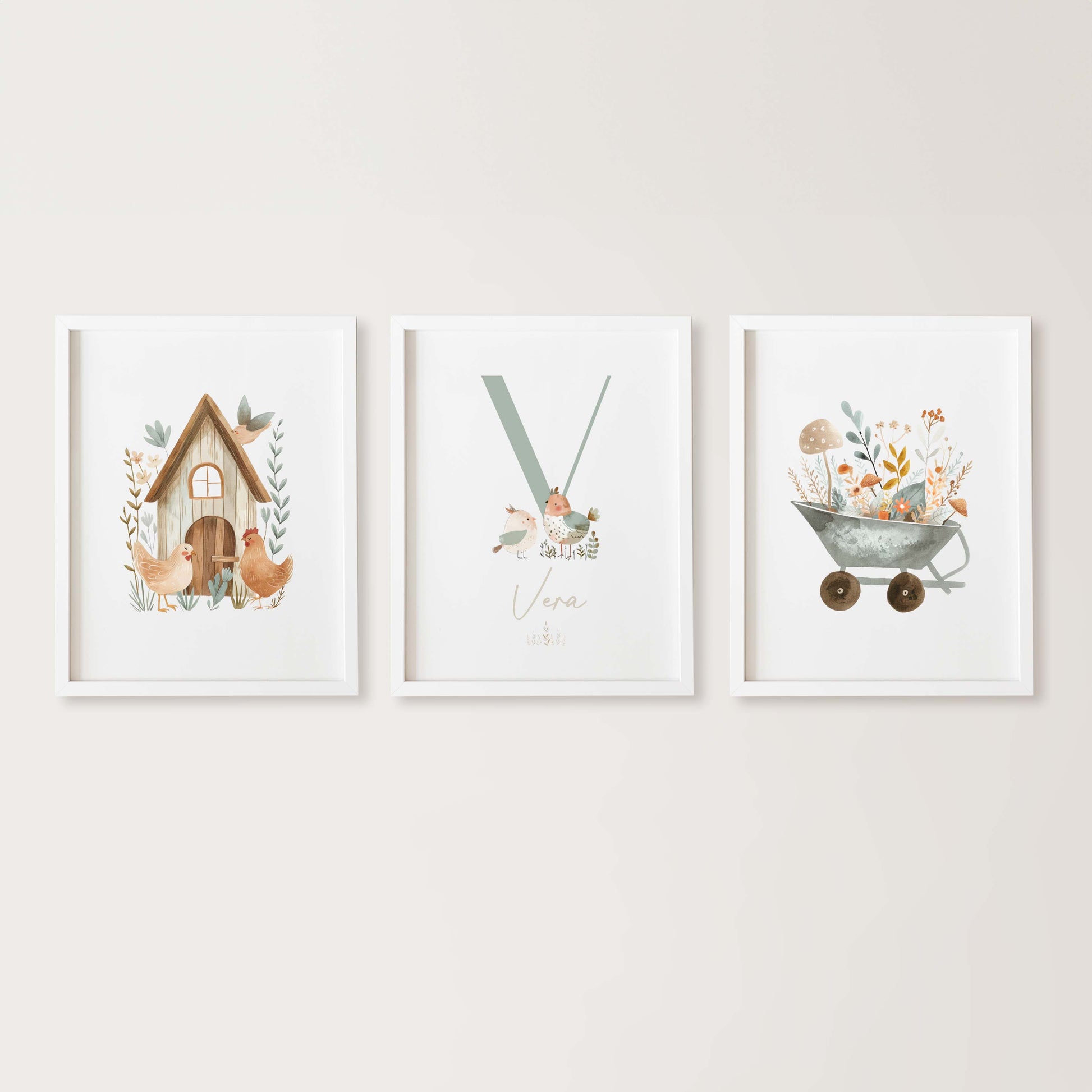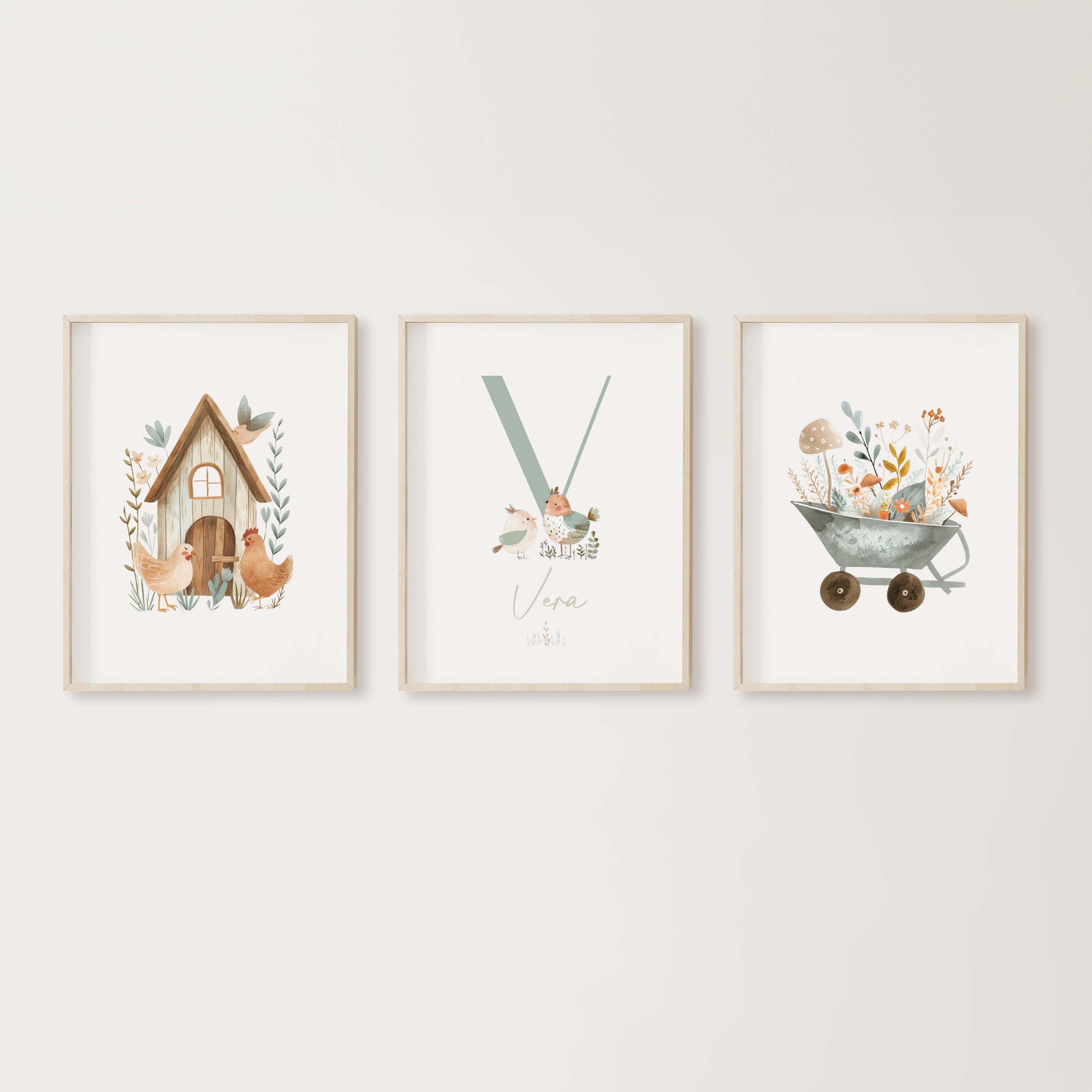 Conjunto de 3 láminas, una de ellas personalizada con el nombre del bebé y, si lo deseas, sus datos de nacimiento. Las ilustraciones son tipo acuarela. Un detalle original y único para decorar su habitación.